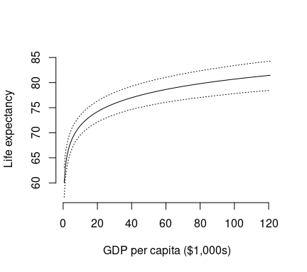 lines(preds$gdpPercap, preds$`2.5%`, lty = 3)