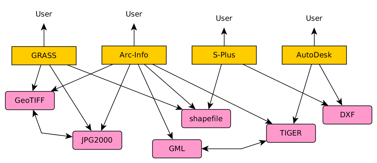 In the 90’s, file formats came up: several systems started supporting various file formats, and dedicated programs that would do certain file format conversions became available. This made many new things possible, such as the integration of S-Plus with Arc-Info, but to fully realize this, each software would have to implement drivers for every file format. Developing new applications or introducing a new file format are both difficult in this model.