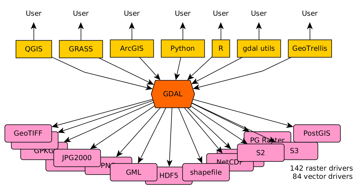 Then came GDAL! This Geospatial Data Abstraction Layer is a software library that reads and writes raster and vector data. Instead of having to write drivers for each file format, application developers needed to only write a GDAL client driver. When proposing a new file format, instead of having to convince many application developers to support it, only a GDAL driver for the new format was required to realize quick adoption. Instead of many-to-many links, only many-to-one links were needed: