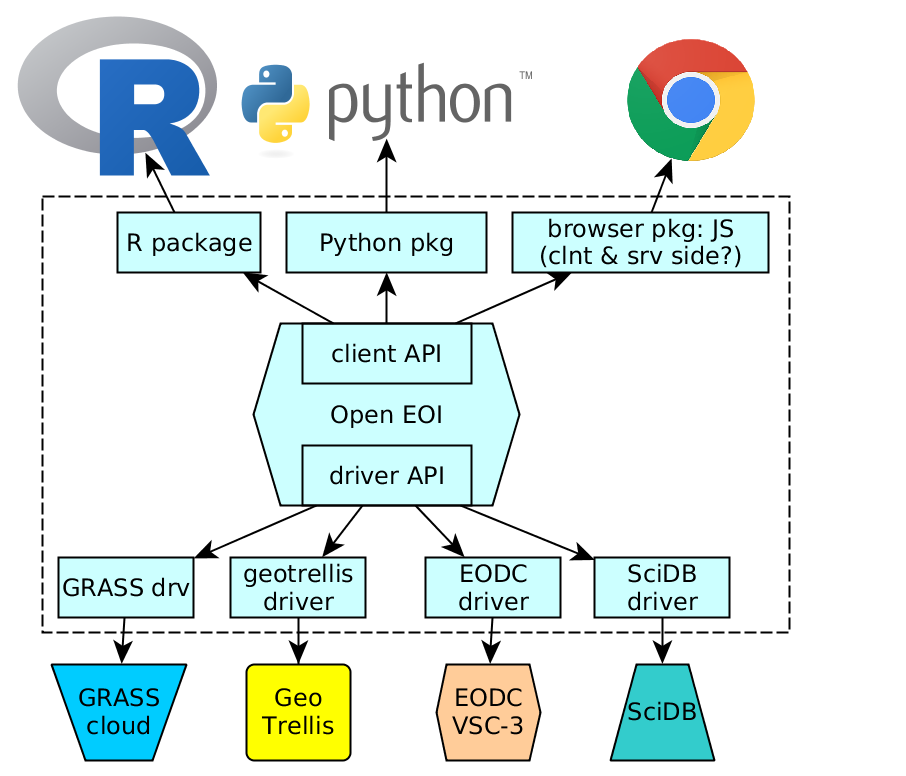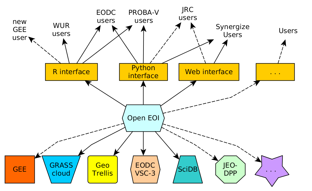 We currently see a plethora of cloud environments that all try to solve the problem of how to effectively analyze Earth Observation data that are too large to download and process locally. It very much reminds of the isolated GIS of the 80’s, in the sense that strongly differing systems have been built with large efforts, and when solving a certain problem in one system it is practically impossible to try to solve it in another system too. Several systems work with data processing back-ends that are not open source. The following figure only shows a few systems for illustration: