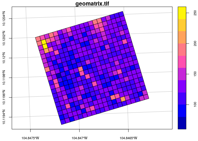 We can read a satellite image through GDAL, e.g. from a GeoTIFF file in the package: