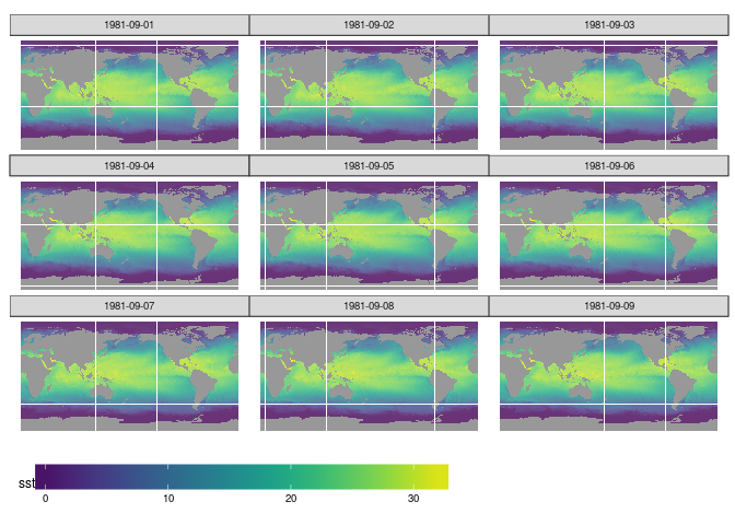 We can now graph the sea surface temperature (SST) using ggplot, which