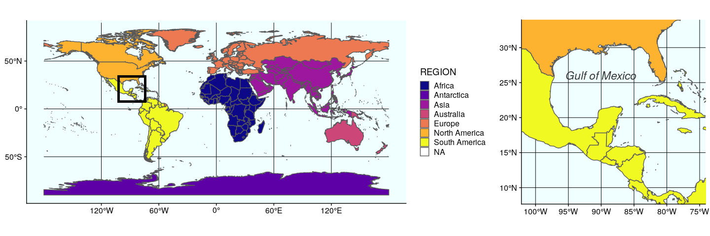 The second approach using the function plot_grid from cowplot to arrange ggplot figures, is quite versatile. Any ggplot figure can be arranged just like the figure above. Several arguments adjust map placement, such as nrow and ncol which define the number of row and columns, respectively, and rel_widths which establishes the relative width of each map. In our case, we want both maps on a single row, the first map gworld to have a relative width of 2.3, and the map ggulf a relative width of 1.
