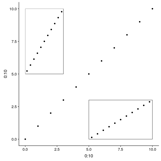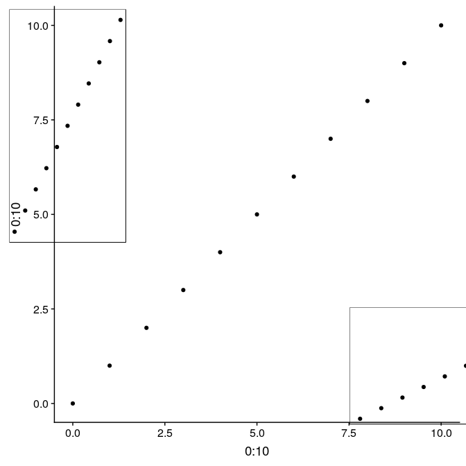 An alternative using the function ggdraw from the package cowplot allows to use relative positioning in the entire plot device. In this case, we build the graph on top of g1, but the initial call to ggdraw could actually be left empty to arrange subplots on an empty plot. Width and height of the subplots are relative from 0 to 1, as well x and y coordinates ([0,0] being the lower-left corner, [1,1] being the upper-right corner). Note that in this case, subplots are not limited to the actual plot region, but can be added anywhere on the device: