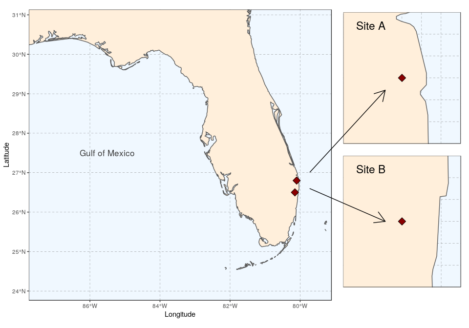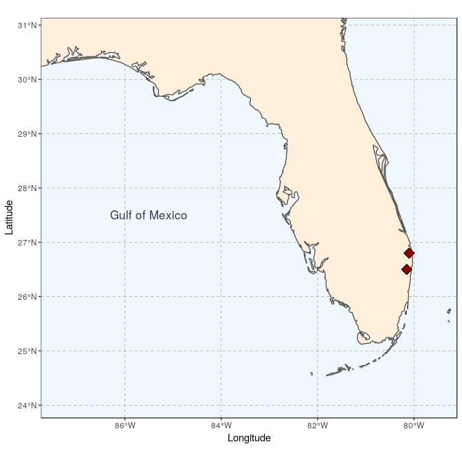 sites <- st_as_sf(data.frame(longitude = c(-80.15, -80.1), latitude = c(26.5,